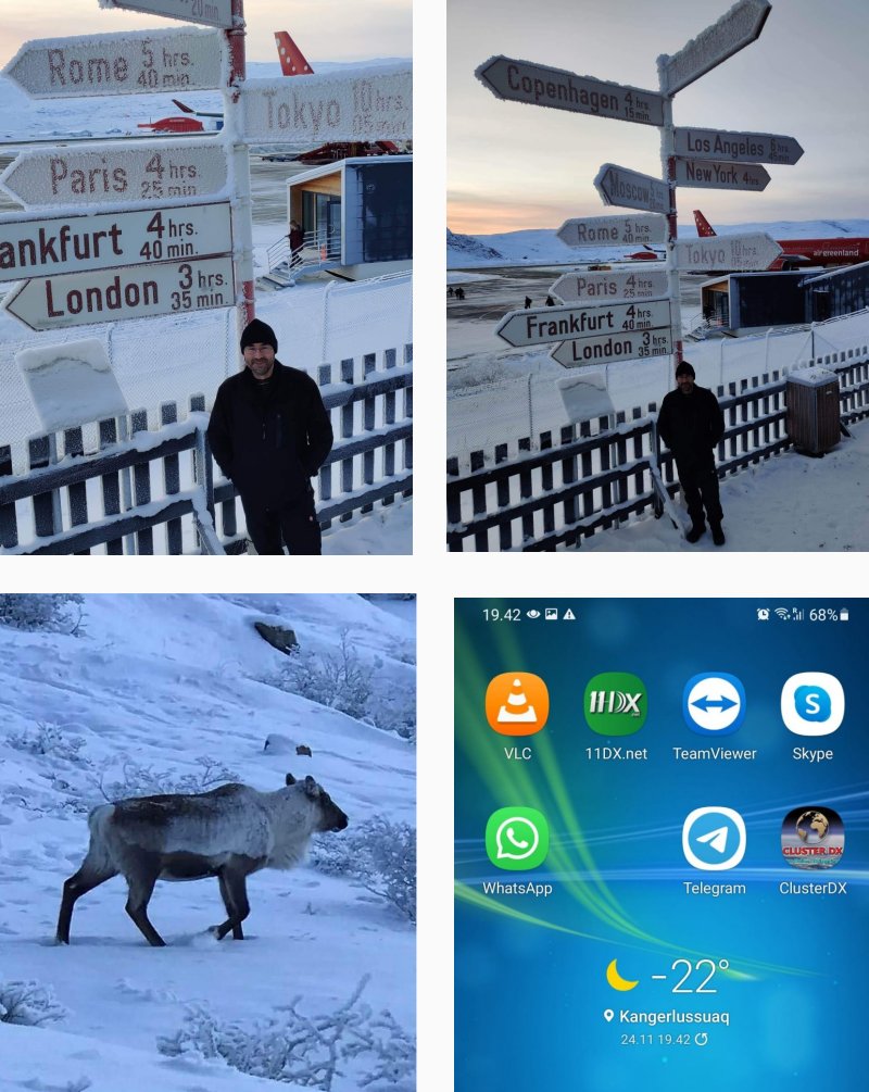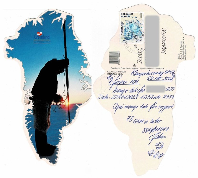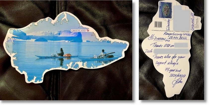 Proofs and Pictures from 38DX/NA018. Pictures (also Proofs) received after the activation: Outward flight to Greenland ![]() Arrival ![]() Antenna and mast equipment, antenna installation great fun in -22° ![]() 3 el Skypper & 1kW = Impressive signals and healthy log. ![]() GSP Coordinates ![]() Direct Postcards ![]() John was blessed with spectacular views ![]() ![]() Live pictures received while activation in progress: ![]() ![]() ![]() ![]() ![]() ![]() Direct Postcard Sent to Jesper: ![]() Direct Postcard Sent to Darran: ![]() YouTube Videos Received From Friends: Click on the thumbnails to play videos.