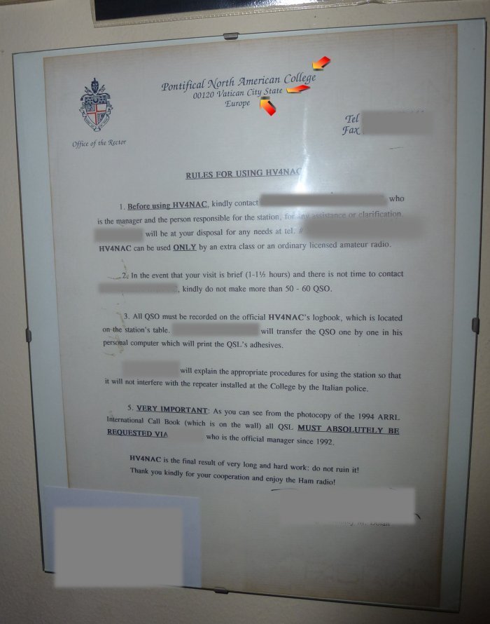 HV4NAC station rules. Pontificial North American College, Vatican City State.