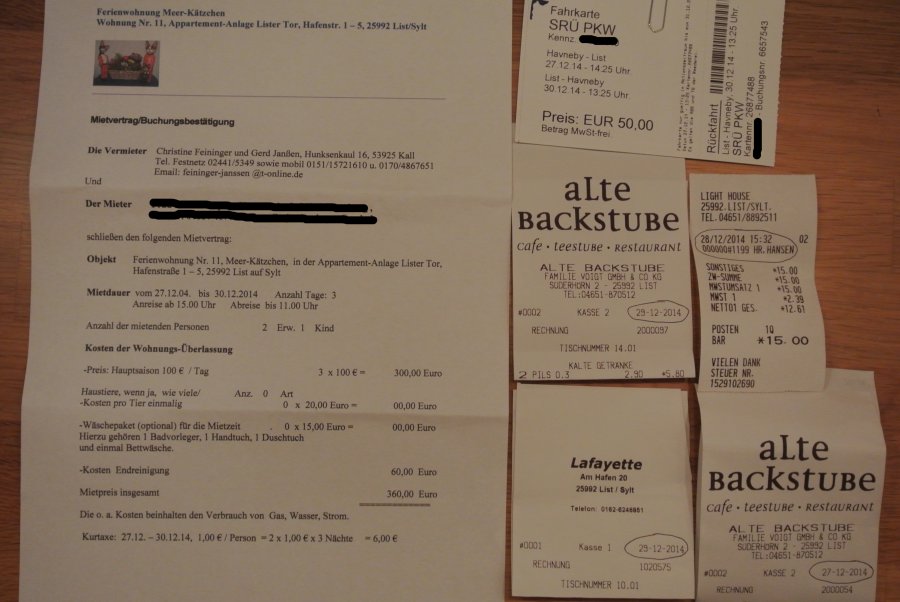 Holiday home bill and various bills and receipts from stay on Sylt Island.