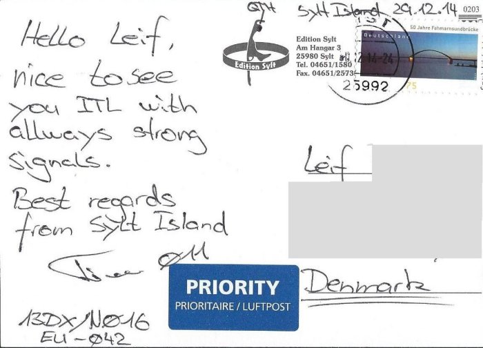 Postcard sent direct from Sylt isl. to 47DX054 Leif