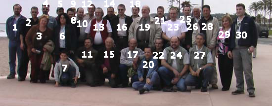 01 14SD051 Chris 02 30SD992 Pedro 03 30SD992 XYL 04 14IR206 Florent 05 14IR707 Willy 06 30DX083 XYL 07 30DX083 Jr. 08 14AT449 Greg 09 30IR012 Jordi 10 30DX083 Francisco 11 30IR262 Joan 12 30IR069 Miquel 13 30AN104 Antonio 14 30IR030 Ton 15 30SD093 Jaume 16 21AT116 Chris 17 14AT716 Alain 18 13DX028 Niko 19 47DX052 Tom 20 14WA055 Patrick (now 14DX055) 21 47DX002 Soren 22 14DX461 Ludo 23 47DX101 John 24 30AT227 Ramon 25 14DX007 Vincent 26 30DX016 Rafael 27 30SD331 Alvaro 28 30AT338 Antonio 29 30AT870 Rosa Mari 30 30DX401 Christian Not present at picture: - 30DX401 father - 1AT070 Simon - 1AT960 Paolo - 239AT101 Luca (1AT976) - 30DX601 Jordi - 30DX012 Xavier - 30AT018 Alfonso (R.I.P) - 30AT070 Alfonso Jr. |